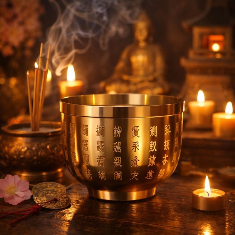 Le Bol Feng Shui des Cent Bénédictions est un objet symbolique traditionnel chinois, finement travaillé en cuivre doré, orné de caractères représentant les bénédictions, la prospérité et l’harmonie.