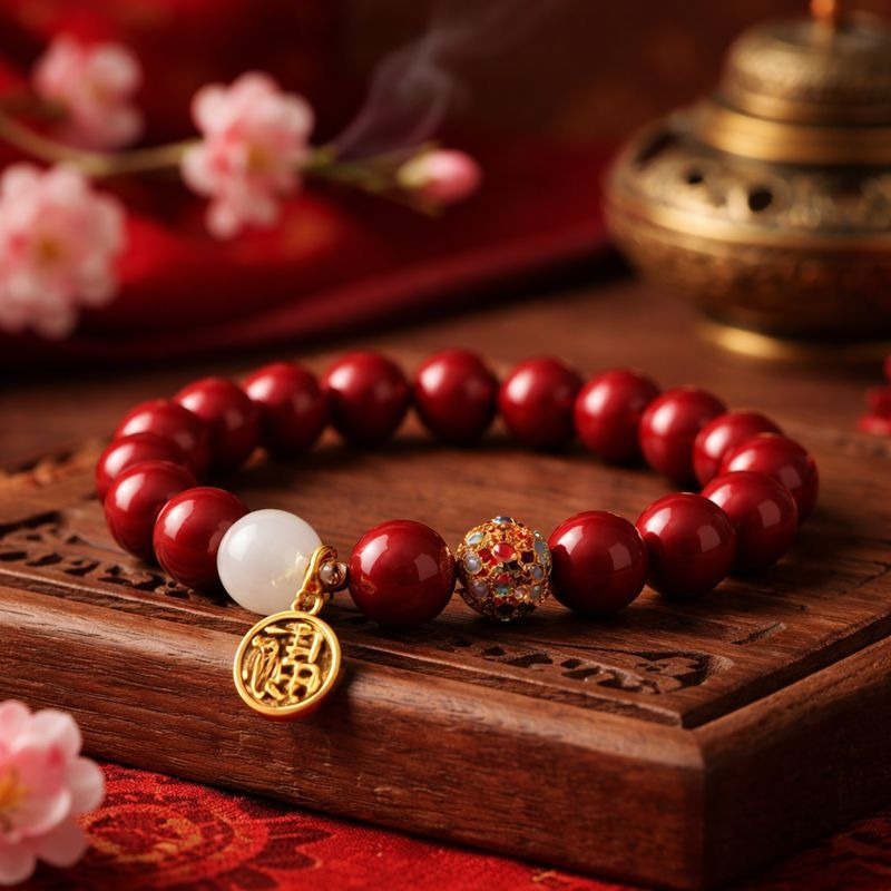 Ce bracelet est composé de perles de cinabre naturel (Zhu Sha 朱砂), associées à une perle claire (jade blanc / pierre d’harmonie) et à un pendentif symbolique de prospérité et de protection selon la tradition chinoise.