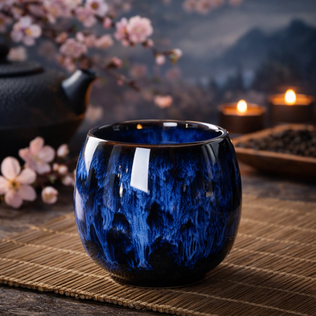 - Découvrez notre Tasse à Thé en Céramique – Glaçure marine; Paysage Doré d’Inspiration Asiatique